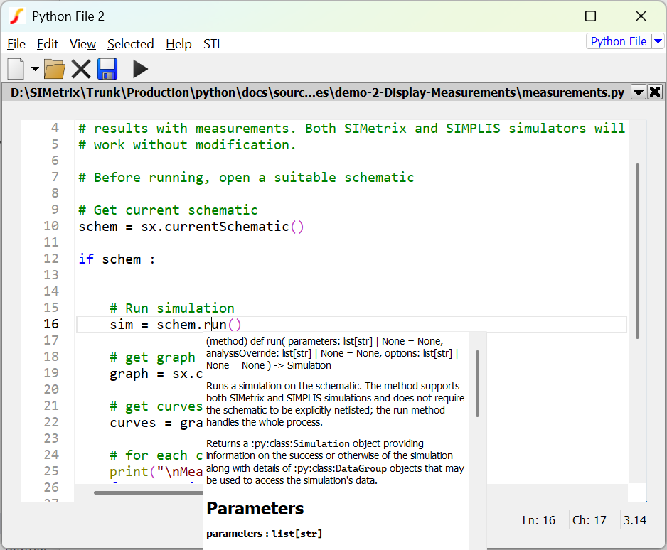 SIMetrix and SIMetrix/SIMPLIS can now be programmed using the Python programming language. The schematic editor, waveform viewer and data handling systems can all be accessed using dedicated object-oriented classes and methods. Both SIMetrix and SIMPLIS simulators may be launched using the same functions with measurement data readily accessible.